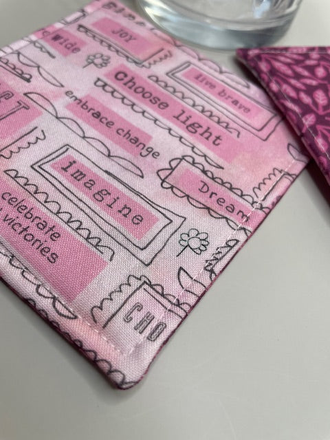 Handmade Cotton Drink Coasters – These 4" x 4" square coasters are crafted from 100% cotton in a variety of unique fabrics, with a different pattern on each side for a fun, reversible design. Perfect for protecting your tables or desk in style, each adds a charming, handcrafted touch to your home or office.