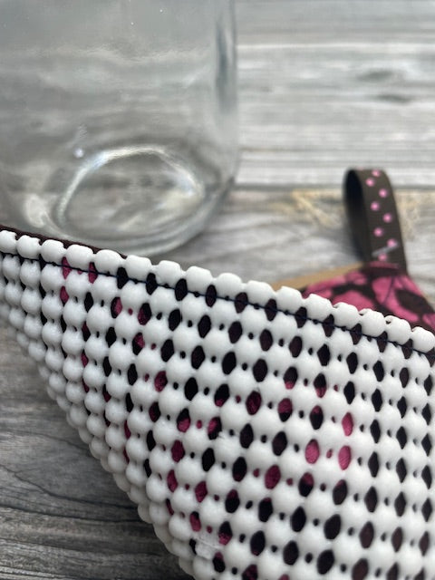Open stubborn jars with ease using our 5.5" x 5.5" handmade Grippy Jar Opener. Featuring a durable, textured grip on one side and soft cotton fabric on the other, it combines function with charm. A convenient hanging loop keeps it within reach in your kitchen, ready to tackle lids big and small. Practical, pretty, and built to last — a must-have for every home.