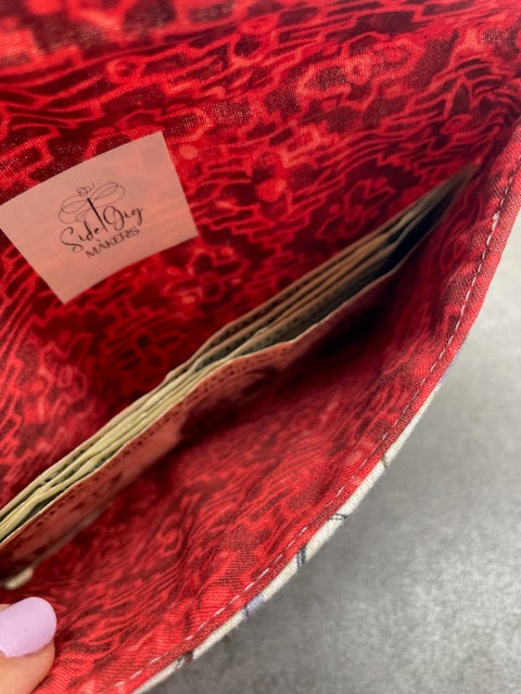 Keep your essentials organized in style with this lightweight handmade phone wallet. Thoughtfully crafted from soft cotton fabric, each wallet is made with unique fabric designs to suit any personality. Designed with two spacious pockets, it can easily hold your cell phone, cash, business cards, or other small must-haves. The secure snap closure keeps everything in place, while its slim, lightweight design slips easily into most purses or bags. Perfect for everyday use, this wallet combines practical storage with handmade charm—making it both functional and one-of-a-kind. Size 7.25" x 4.5"