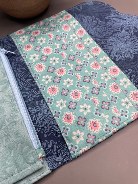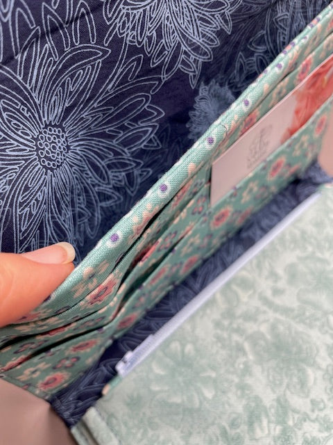 Stay organized in style with this handmade fabric wallet. Crafted from quality cotton fabrics, it features a secure snap closure to keep everything neatly in place. Inside, you’ll find 6 card slots, 3 roomy pockets for paper money or other items, and a zippered pocket for coins or small essentials. Lightweight design fits perfectly into your purse — making it easy to take on the go. This wallet is both practical and stylish, and makes a thoughtful handmade gift.
